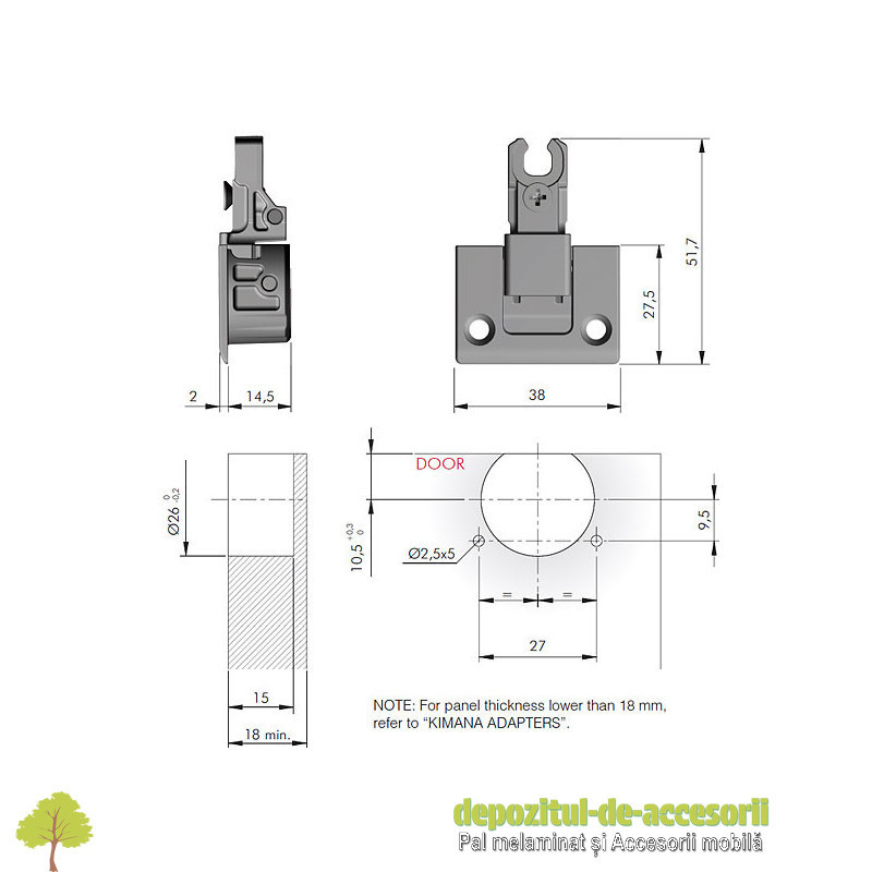 Dimensiunile mici (găurire cu freză de Ø 26mm atat pentru usa cat si pentru laterala corpului), designul minimalist si elegant contribuie sa faca din KIMANA nu doar o balama functionala, ci si un produs unic in genul sau.