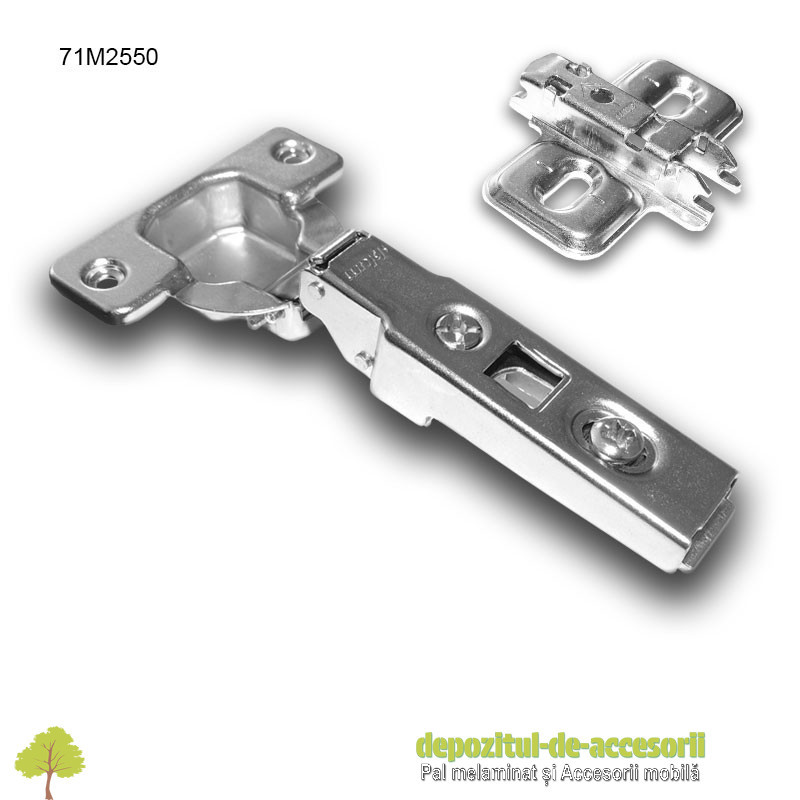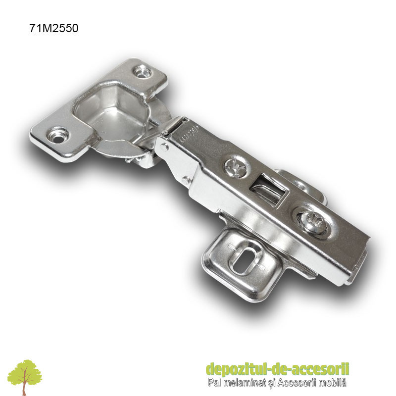 Balama uși aplicate deschidere 100° Modul 91M2550: balama complet metalică, nichelată, folosită în aplicație de uși aplicate. Balamaua este prevăzută cu plăcuță montaj cu înălțarea de 0mm și cupă cu arc pentru...