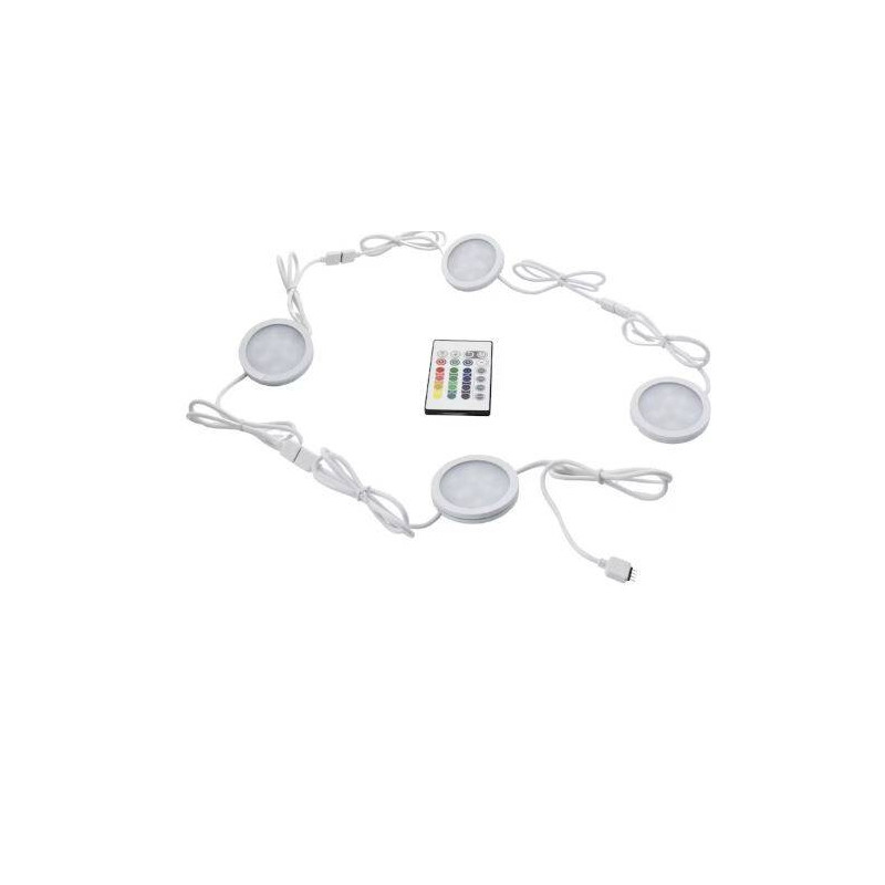Set 4 spoturi LED dulap RGB cu telecomandă, 12V, 4x2W, iluminat mobilier interior: Setul de 4 spoturi LED rotunde COMTEC MF0011-42000 este o soluție modernă de iluminat decorativ pentru dulapuri, vitrine, mobilier sau spații interioare. Funcționează la 12V DC și include 4 spoturi de câte 2W fiecare, oferind iluminare RGB cu posibilitate de schimbare a culorilor prin telecomandă.