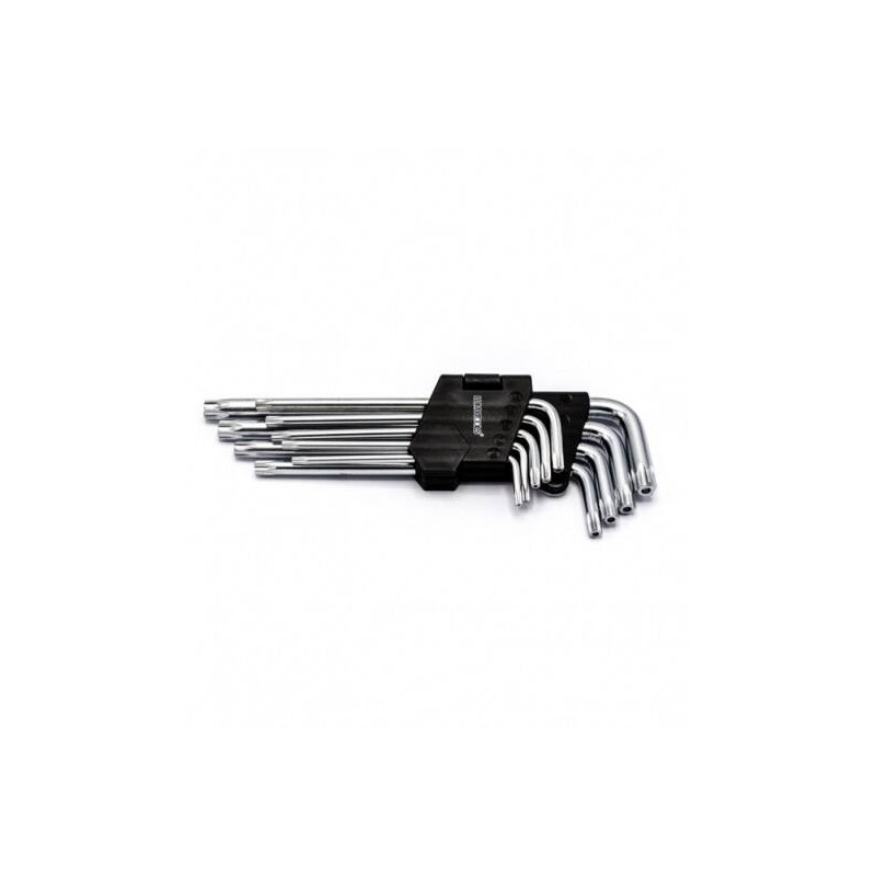 Fabricate din oțel crom-vanadiu (Cr-V), cheile asigură rezistență ridicată la uzură și durabilitate în utilizare intensă. Setul include dimensiuni standard de la T10 la T50, acoperind o gamă largă de aplicații, de la reparații auto până la lucrări tehnice. Organizate într-un suport practic, aceste chei oferă eficiență, precizie și ușurință în depozitare.