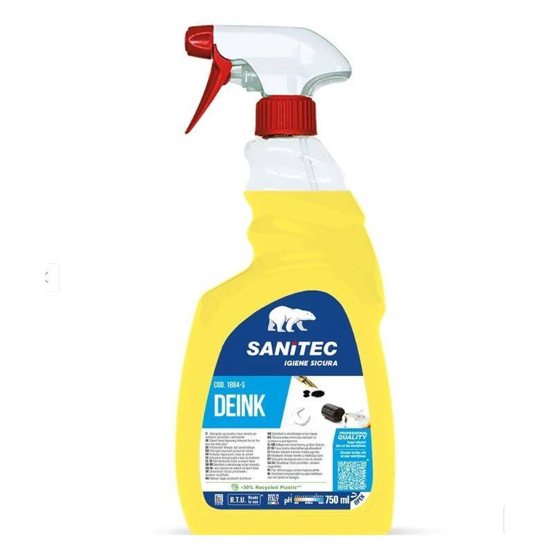 AutentificareDetergent solvent pentru pete de cerneală Sanitec Deink, 750 ml, îndepărtare cerneală, marker și pete dificile: Sanitec Deink 750 ml este un detergent profesional pe bază de solvent, conceput special pentru îndepărtarea petelor dificile de cerneală, marker permanent, ștampilă și alte tipuri de murdărie persistentă. Formula sa puternică acționează rapid asupra petelor, dizolvându-le eficient fără a necesita frecare intensă, ceea ce îl face ideal pentru suprafețe sensibile sau utilizare profesională.