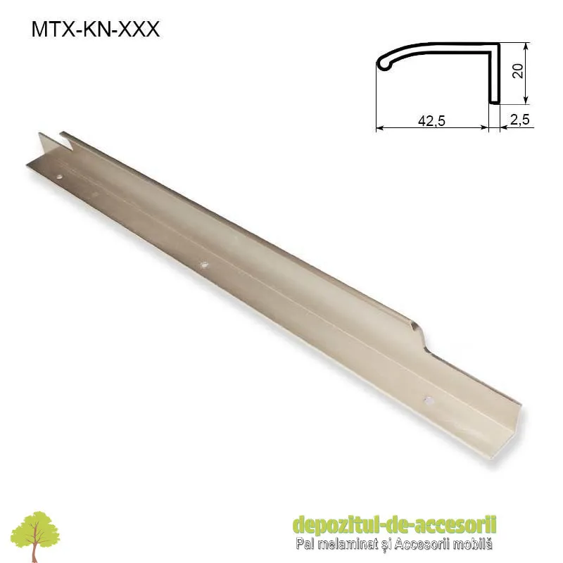 Mâner mobilier MTX-KN-450, INOX: mânerul, face parte din categoria mânerelor cu design modern având un finisaj de excepție cu aspect de inox periat. Construit integral din aluminiu, mânerul se încadrează în orice tip de mobilier modern. Culoarea asociată finisajului este ”șampanie”. Lungimea totală este de 450mm.
