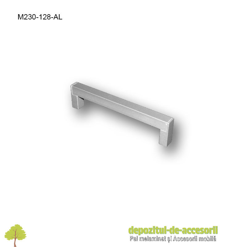 Mâner mobilier Aluminiu M230-128-AL: mânerul cu distanța între găuri de 128mm, construit integral din aluminiu, face parte din categoria accesoriilor de mobilier modern, având un design simplu și fiind foarte practic, cu suprafețe rezistente la zgâriere și foarte ușor de întreținut (nu necesită soluții speciale de curățare).