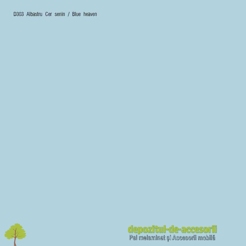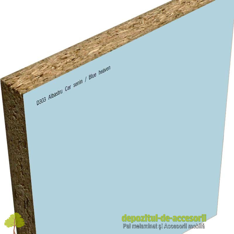 AutentificarePAL Melaminat Albastru cer senin D303 supermat: Placa aglomerată din lem, (din așchii lemnoase impregnate cu aldehidă formică), având suprafețele acoperite cu un finisaj foarte durabil, în decor uni, folosită în construcția mobilierului expus unei uzuri intense și murdăririi frecvente. Este recomandat pentru utilizare în industria mobilei și în amenajări interioare.