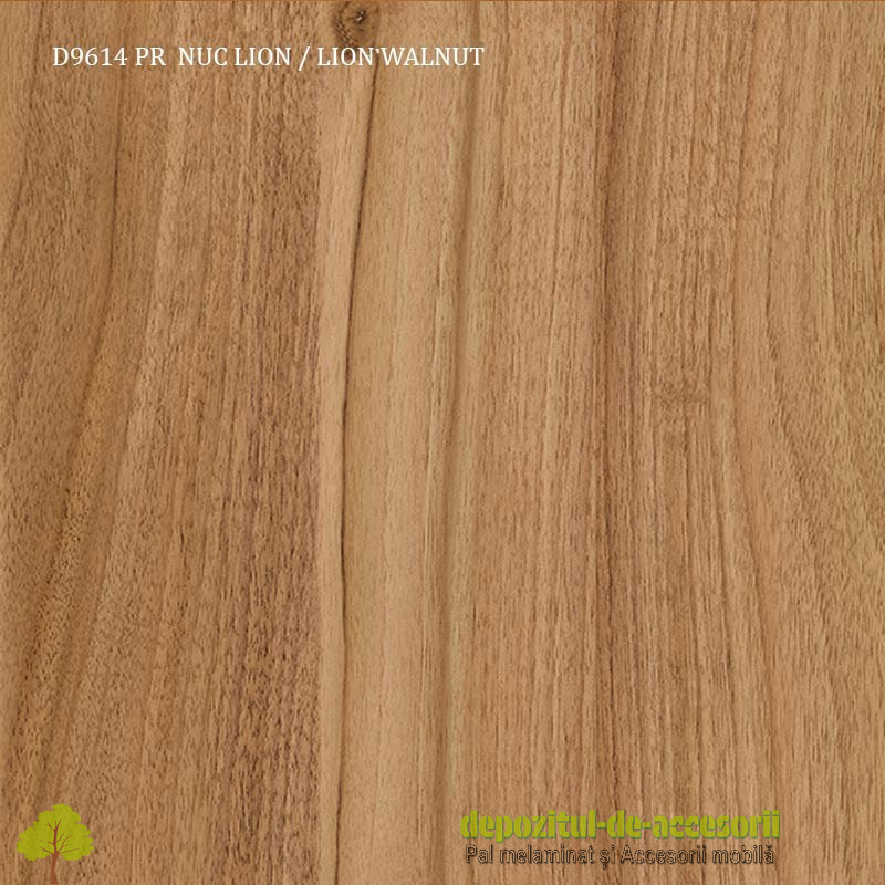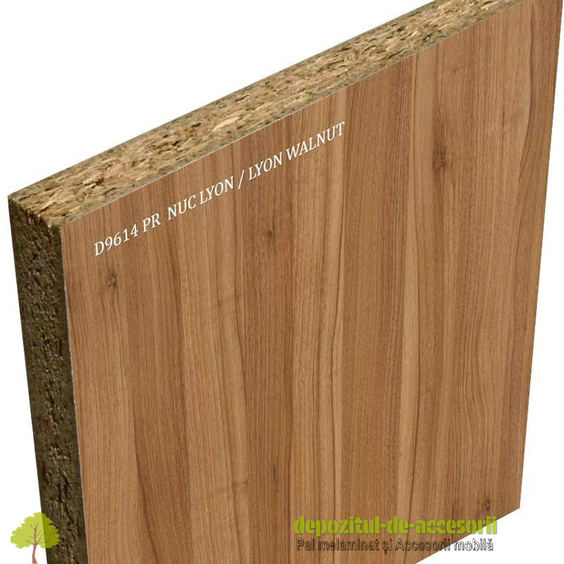 PAL Melaminat Nuc Lyon D9614 PR Krono: Placa aglomerată din lem, (așchii lemnoase impregnate cu aldehidă formică), având suprafețele acoperite cu un finisaj durabil, în decor lemn autentic, suprafețe cu efect de culoare semi mat, efect tactil neted striat, folosită în construcția mobilierului expus unei uzuri intense și murdăririi frecvente.