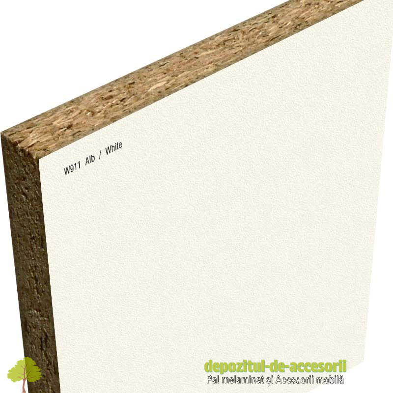 PAL Melaminat Alb W911 SM Egger: Placa aglomerată din lem, (din așchii lemnoase impregnate cu aldehidă formică), având suprafețele acoperite cu un finisaj foarte durabil, în decor uni, cu suprafețe semi-mate, folosită în construcția mobilierului expus unei uzuri intense și murdăririi frecvente. Este recomandat pentru utilizare în industria mobilei și în amenajări interioare.