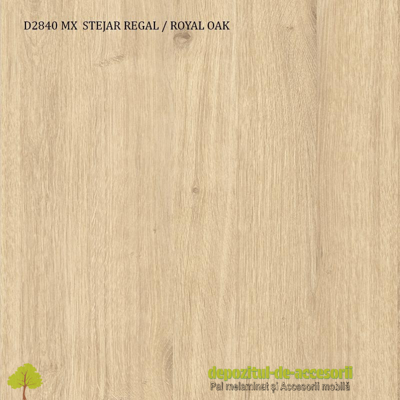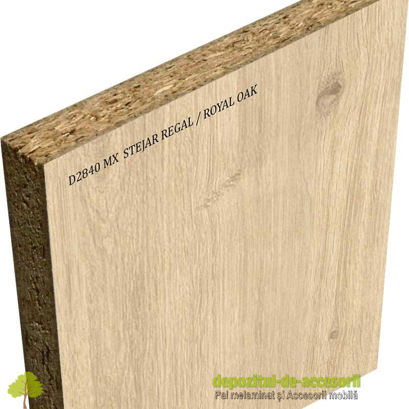 PAL Melaminat Stejar Regal D2840 MX Krono: Placa aglomerată din lemn, (așchii lemnoase impregnate cu aldehidă formică), având suprafețele acoperite cu un finisaj durabil, în decor lemn autentic model 2015, suprafețe cu efect de culoare semi mat, efect tactil de fibre soft, antiderapant, folosită în construcția mobilierului expus unei uzuri intense și murdăririi frecvente. PAL-ul melaminat este rezistent la diluanți slabi și nitro. Constructiv, PAL-ul melaminat este format din trei straturi, unul central ce conferă rezistența materialului si două, la suprafețe, din granule fine, pentru a oferi suprafețe plane și fine necesare procesului de laminare. Aceste suprafețe sunt acoperite cu hârtie decor impregnată cu rășini melaminice, prin presare, la temperaturi ridicate. Decorul păstreaza trendul decorurilor rustice care aduc o grafică superioară a acestuia prin introducerea nodurilor sau imperfecțiunile specifice decorurilor rustice din lemnul autentic.