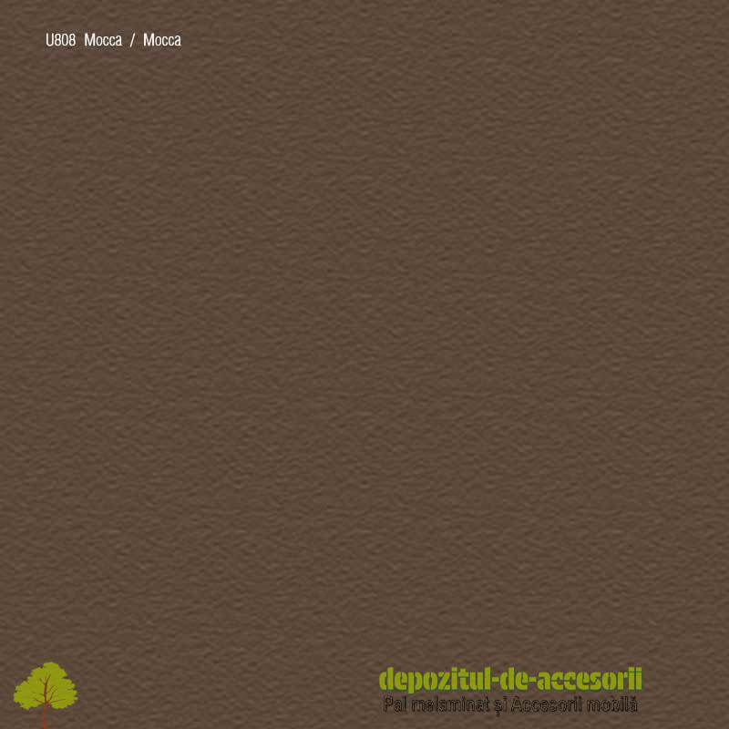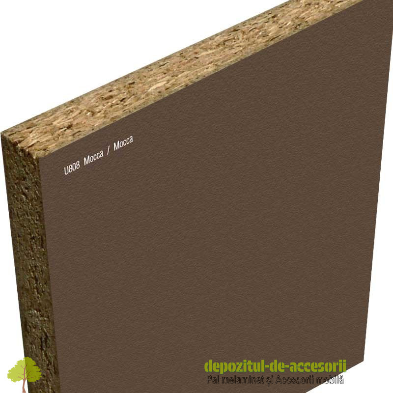 AutentificarePAL Melaminat Mocca U808-ST9: Placa aglomerată din lem, (așchii lemnoase impregnate cu aldehidă formică), având suprafețele acoperite cu un finisaj durabil, în decor uni, cu suprafețe efect de culoare ușor perlate, super mate, catifelate, aspect elegant, folosită în construcția mobilierului expus unei uzuri intense și murdăririi frecvente.