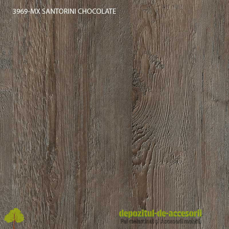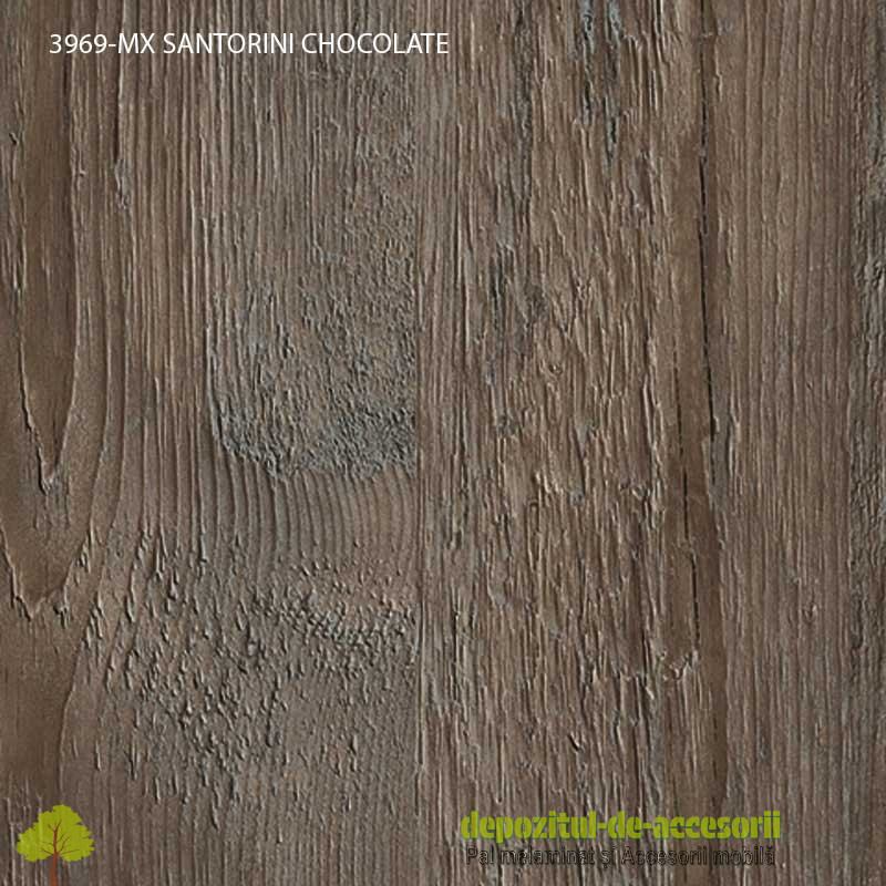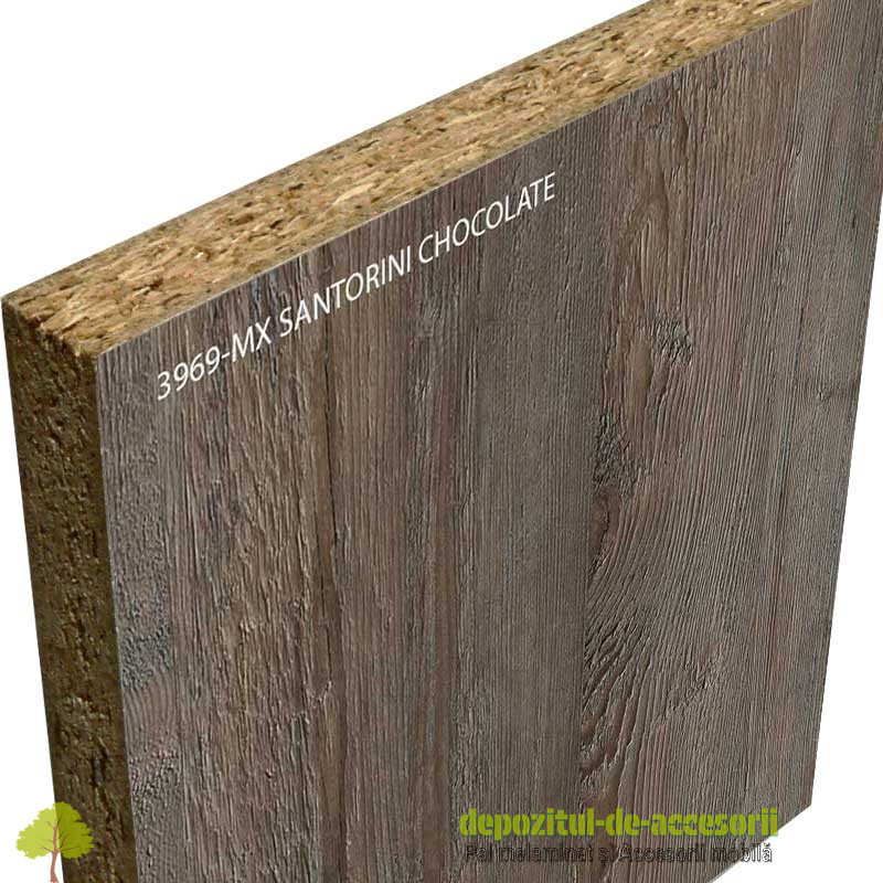 PAL Melaminat SANTORINI CHOCOLATE 3969 MX Krono Swiss: decor lemn autentic model 2015, suprafețe cu efect de culoare semi mat, efect tactil de fibre soft longitudinale, folosită în construcția mobilierului expus unei uzuri intense și murdăririi frecvente. Placa aglomerată din lemn, (așchii lemnoase impregnate cu aldehidă formică), având suprafețele acoperite cu un finisaj durabil. PAL-ul melaminat este rezistent la diluanți slabi și nitro. Constructiv, PAL-ul melaminat este format din trei straturi, unul central ce conferă rezistența materialului si două, la suprafețe, din granule fine, pentru a oferi suprafețe plane și fine necesare procesului de laminare. Aceste suprafețe sunt acoperite cu hârtie decor impregnată cu rășini melaminice, prin presare, la temperaturi ridicate. Decorul face parte din noile decoruri de lemn autentic 2015.