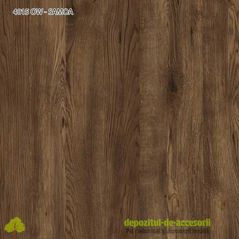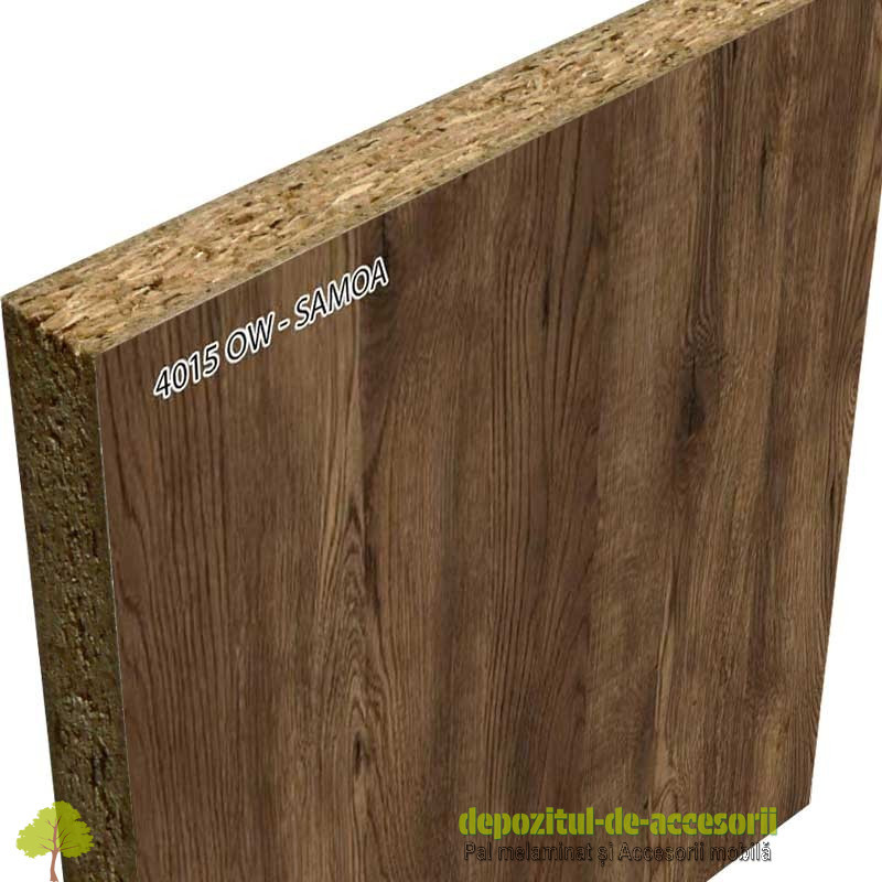 PAL Melaminat SAMOA 4015 OW Krono Swiss: decor lemn autentic model 2019, suprafețe cu efect de culoare semi mat, efect tactil de fibre fine, sincrone, longitudinale, folosită în construcția mobilierului expus unei uzuri intense și murdăririi frecvente. Placa aglomerată din lemn, (așchii lemnoase impregnate cu aldehidă formică), având suprafețele acoperite cu un finisaj durabil. PAL-ul melaminat este rezistent la diluanți slabi și nitro. Constructiv, PAL-ul melaminat este format din trei straturi, unul central ce conferă rezistența materialului si două, la suprafețe, din granule fine, pentru a oferi suprafețe plane și fine necesare procesului de laminare. Aceste suprafețe sunt acoperite cu hârtie decor impregnată cu rășini melaminice, prin presare, la temperaturi ridicate. Decorul face parte din noile decoruri de lemn autentic 2015.