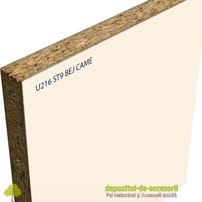 AutentificarePAL Melaminat Bej Came U216 ST9 EGGER: în decor uni, suprafețe cu efect de culoare mat, efect tactil neted catifelat, folosită în construcția mobilierului expus unei uzuri intense și murdăririi frecvente. Placa aglomerată din lemn, (așchii lemnoase impregnate cu aldehidă formică), având suprafețele acoperite cu un finisaj durabil.