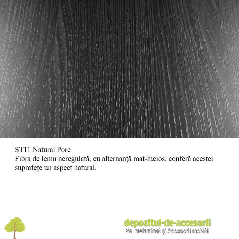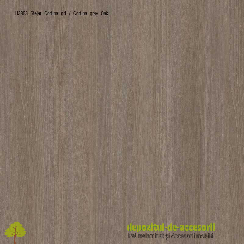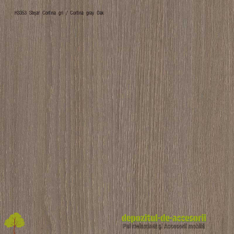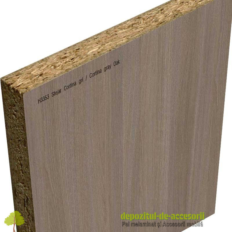 AutentificarePAL Melaminat Stejar Cortina gri H3353 ST11: Placa aglomerată din lem, (așchii lemnoase impregnate cu aldehidă formică), având suprafețele acoperite cu un finisaj durabil, în decor lemn autentic, suprafețe cu efect de culoare mat, cu pori naturali în lungul fibrei, folosită în construcția mobilierului expus unei uzuri intense și murdăririi frecvente.