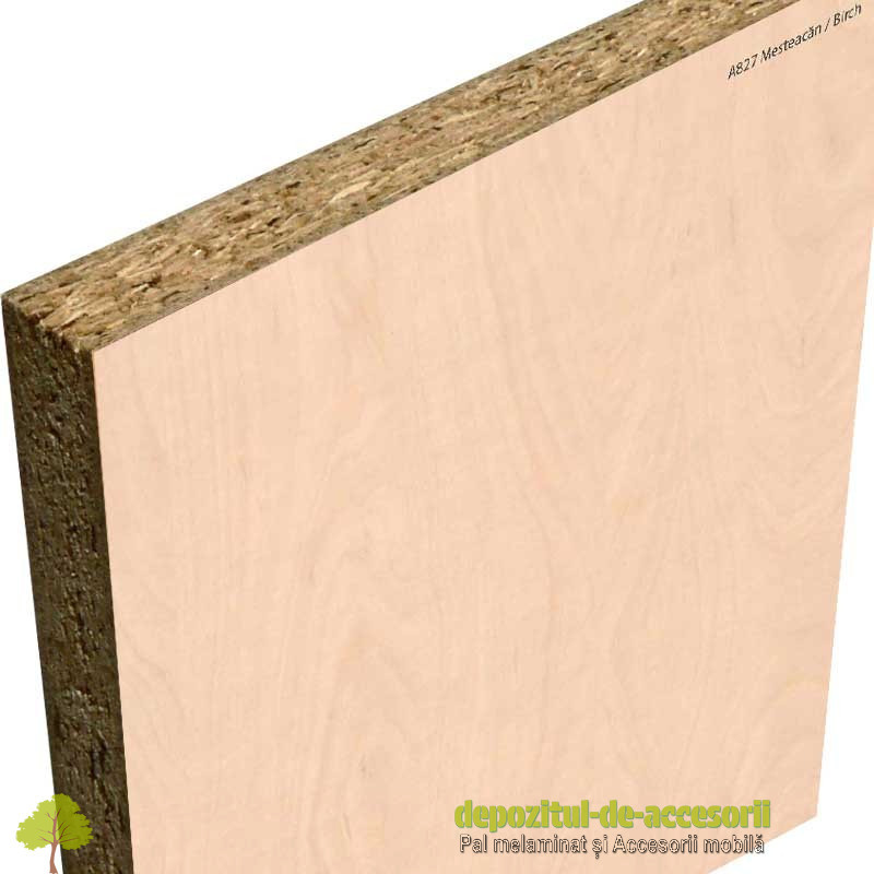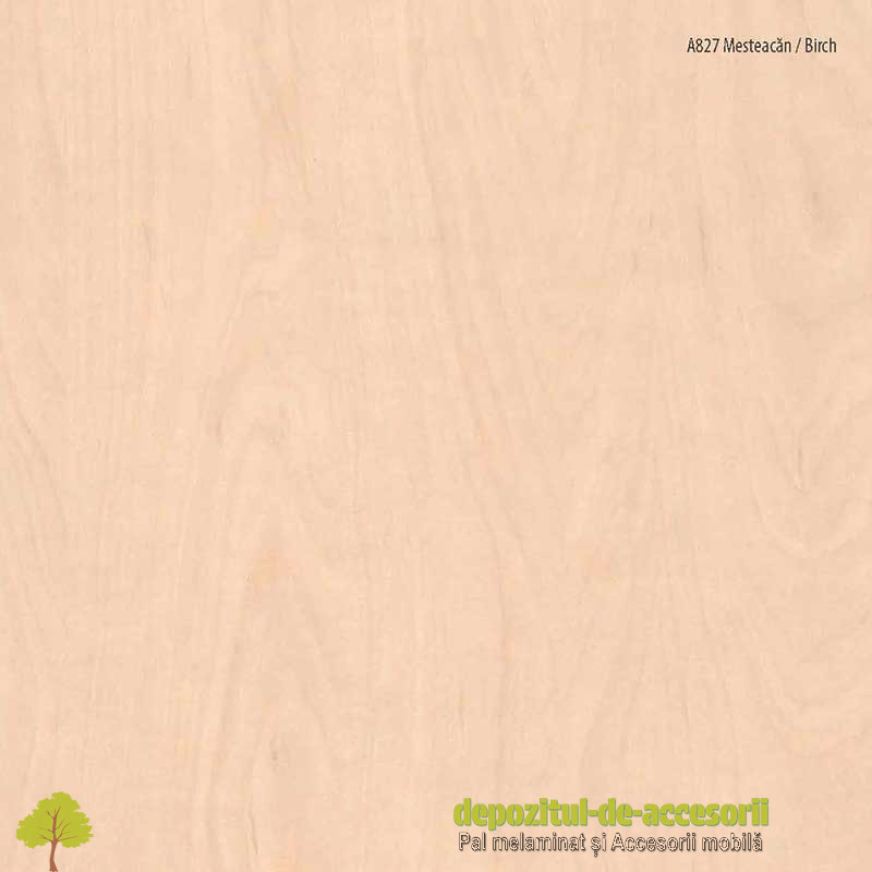 Pal melaminat Mesteacăn alb A827 PS11 Kastamonu: PAL-ul melaminat produs de producătorul grec Kastamonu, are o densitate medie, uzuală, și o foarte bună rezistență în timp, putându-se prelucra foarte ușor. Face parte din gama de decoruri lemn, imitând foarte bine atât decorul dar și textura suprafețelor. PAL-ul melaminat este rezistent la diluanți slabi și nitro. Constructiv, PAL-ul melaminat este format din trei straturi, unul central ce conferă rezistența materialului si două, la suprafețe, din granule fine, pentru a oferi suprafețe plane și fine necesare procesului de laminare. Aceste suprafețe sunt acoperite cu hârtie decor impregnată cu rășini melaminice, prin presare, la temperaturi ridicate.