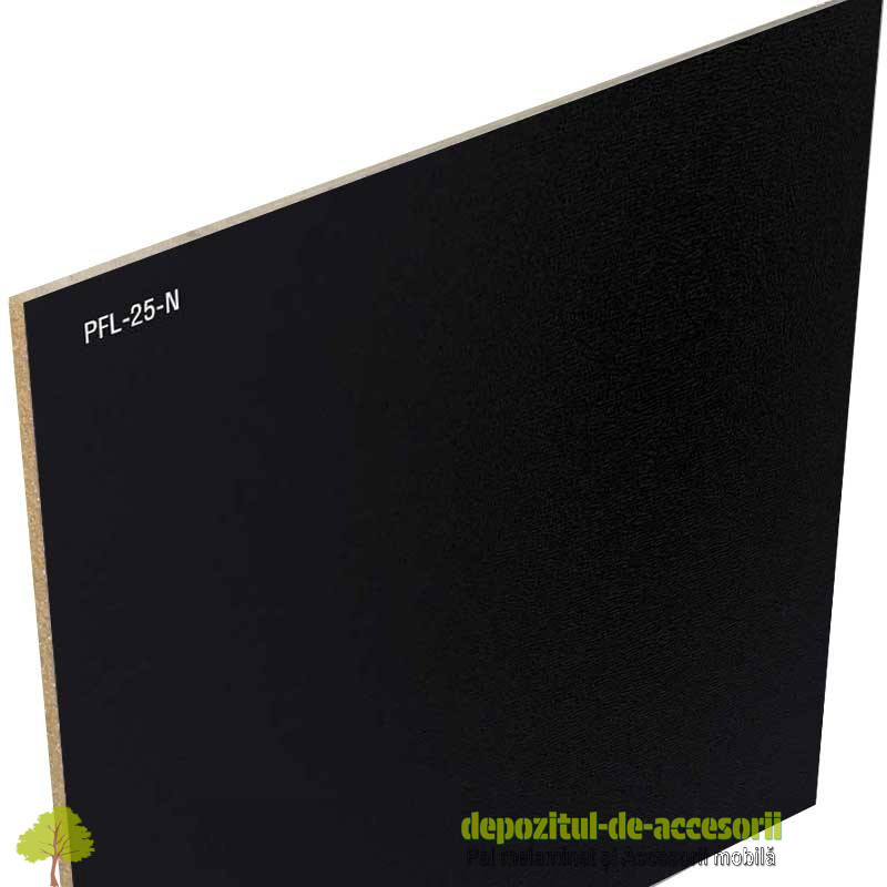 PFL melaminat HDF negru 2,5mm Egger: Foiaia de PFL are dimensiunea de 2800mm x 2070mm, se utilizează frecvent la acoperirea spatelui corpurilor sau la fundurile de sertar. În decorațiuni interioare se folosește la modelarea diverselor decorațiuni florale sau abstracte prin decupare manuală sau prin frezare CNC. Are grosimea de 2,5mm.
