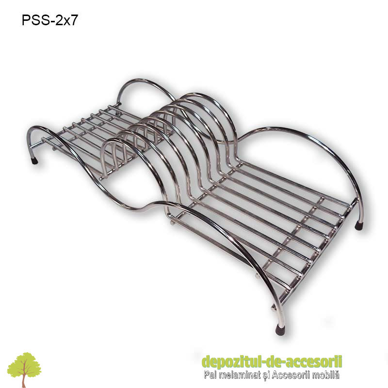Picurător vase - Scurgător vase pentru suprafețe: sistemul picurător vase este de tip suprafețe, putând fi așezat cu ușurință deasupra chiuvetei sau într-o tavă de dimensiuni potrivite, pe orice suprafețe. Este confecționat din sârmă de oțel de 6mm, cromată, asigurând astfel o durată mare de viață. Oferă spațiu pentru 14 farfurii sau 7 farfurii, pahare și veselă.