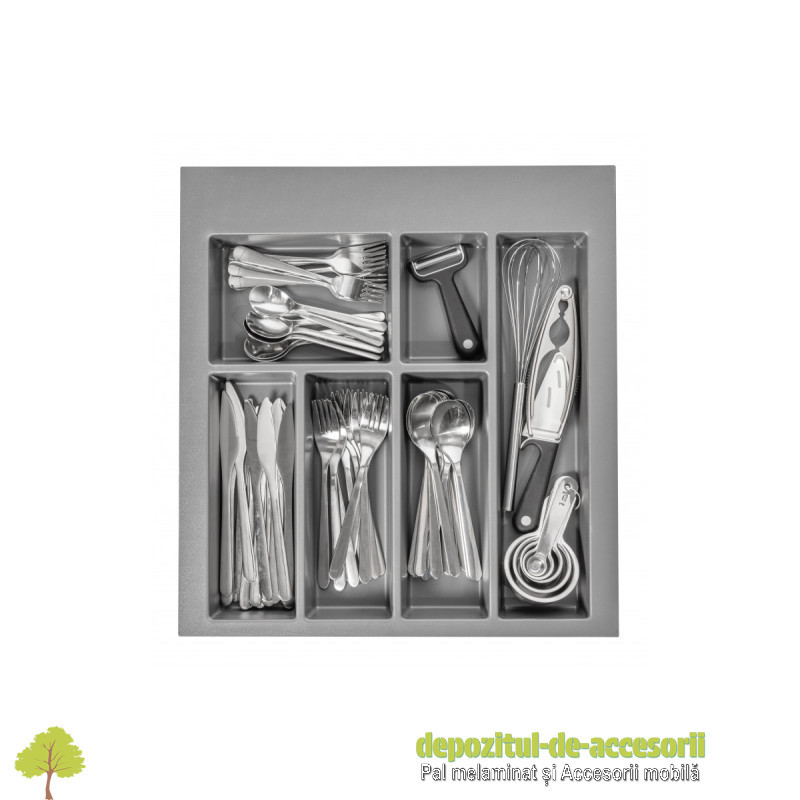 Organizator tacâmuri AXISSPACE, corp 500mm, antracit: Organizatorul de tacâmuri AXISSPACE este conceput pentru a se potrivi în sertare cu lățimea exterioară a corpului de 500 mm. Este fabricat din plastic de înaltă calitate, durabil și ușor de curățat. Designul său modular și compartimentarea inteligentă permit organizarea eficientă a tacâmurilor și a altor ustensile de bucătărie. Marginile pot fi decupate pentru a se potrivi perfect dimensiunilor interioare ale sertarului.