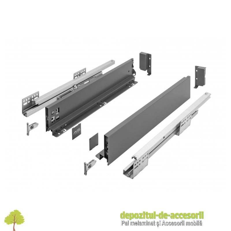 AutentificareSertar AXISPRO tip TANDEMBOX-H84mm, L550mm antracit: Sertarul metalic, cu înălțimea de 84mm și lungimea de 550mm, tip TANDEMBOX, de culoare antracit operează foarte silențios, are extragere totală și amortizare la închidere. Încărcarea maximă: 40Kg