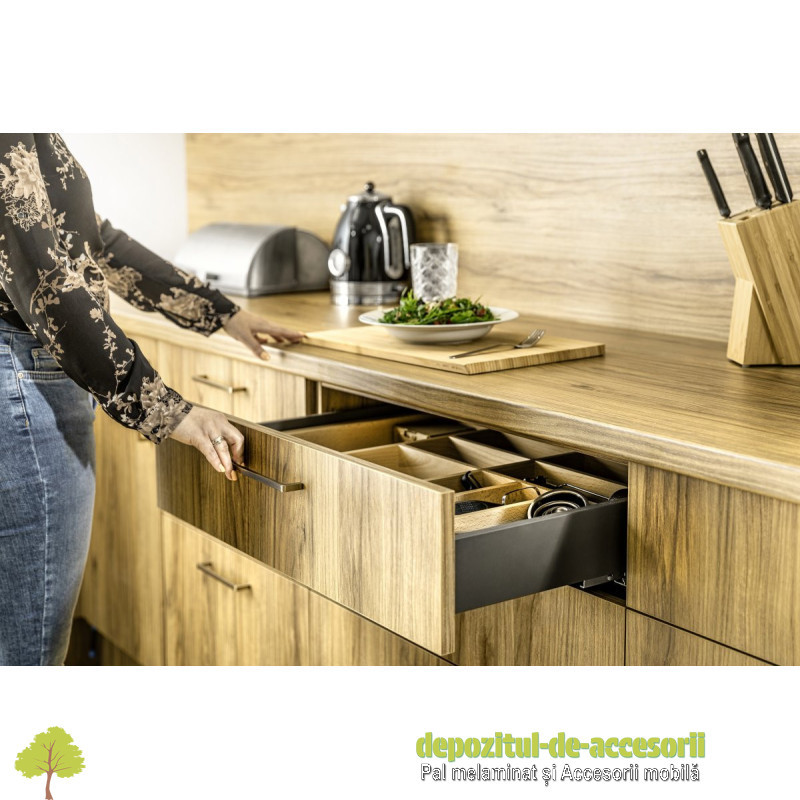 Sertar AXISPRO tip TANDEMBOX-H84mm, L550mm antracit: Sertarul de înălțime redusă Axis Pro are o durabilitate ridicată, certificată pentru 60.000 de cicluri. Acesta oferă extensie completă în lungimi de la 250 la 600 mm, iar mecanismul de închidere silențioasă garantează o funcționare silențioasă și o închidere ușoară a sertarului. Cele 5 variante de înălțime îl vor face să se potrivească perfect în bucătăria dumneavoastră, iar lateralul sertarului cu o lățime de doar 14 mm permite utilizarea maximă a spațiului intern al mobilei. Sarcina pe sertar vă permite să așezați în el până la 40 kg de diverse produse. Instalarea este ușoară datorită reglării convenabile din interior, reglării înclinării și reglării orizontale în intervalul de +- 2 mm. Sertarul se potrivește cu o gamă largă de sisteme de organizare a spațiului, inserții pentru tacâmuri, covorașe și sortatoare de deșeuri.