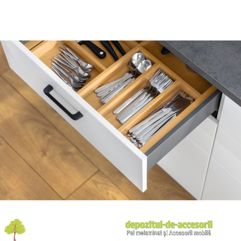 Conținut kit sertar: 2 buc. glisiere (S + D), 2 buc. laterale sertar (S + D), 2 buc. conectori perete spate (S + D), 2 buc. conectori frontali și 2 buc. capace acoperire sistem reglaj.