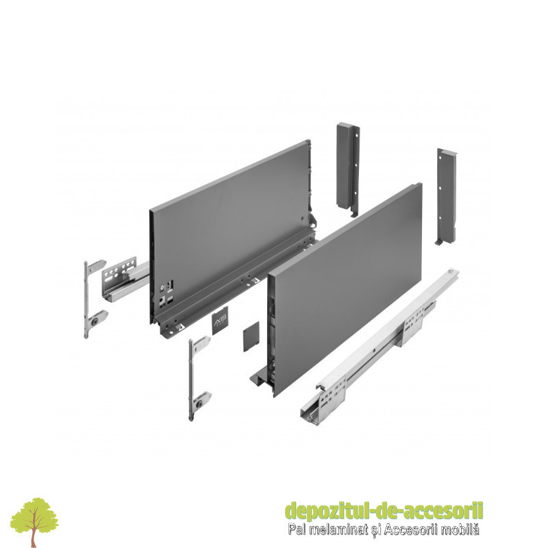 AutentificareSertar AXISPRO tip TANDEMBOX-H199mm, L500mm antracit: Sertarul metalic, cu înălțimea de 199mm și lungimea de 500mm, tip TANDEMBOX, de culoare antracit operează foarte silențios, are extragere totală și amortizare la închidere. Încărcarea maximă: 40Kg