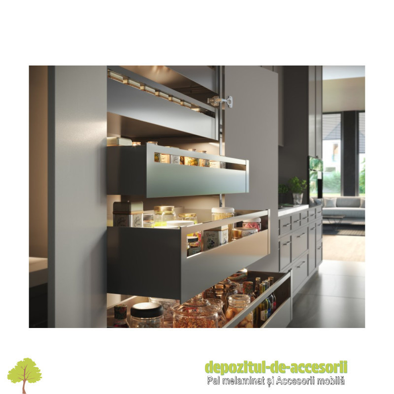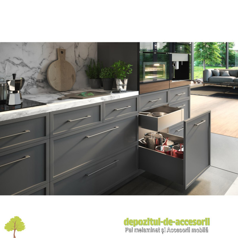 Sertar AXISPRO tip TANDEMBOX-H199mm, L550mm antracit: Sertarul extra-înalt Axis Pro are o durabilitate ridicată, certificată pentru 60.000 de cicluri. Acesta oferă extensie completă în lungimi de la 250 la 600 mm, iar mecanismul de închidere silențioasă garantează o funcționare silențioasă și o închidere ușoară a sertarului. Cele 5 variante de înălțime îl vor face să se potrivească perfect în bucătăria dumneavoastră, iar lateralul sertarului cu o lățime de doar 14 mm permite utilizarea maximă a spațiului intern al mobilei. Sarcina pe sertar vă permite să așezați în el până la 40 kg de diverse produse. Instalarea este ușoară datorită reglării convenabile din interior, reglării înclinării și reglării orizontale în intervalul de +- 2 mm. Sertarul se potrivește cu o gamă largă de sisteme de organizare a spațiului, inserții pentru tacâmuri, covorașe și sortatoare de deșeuri.