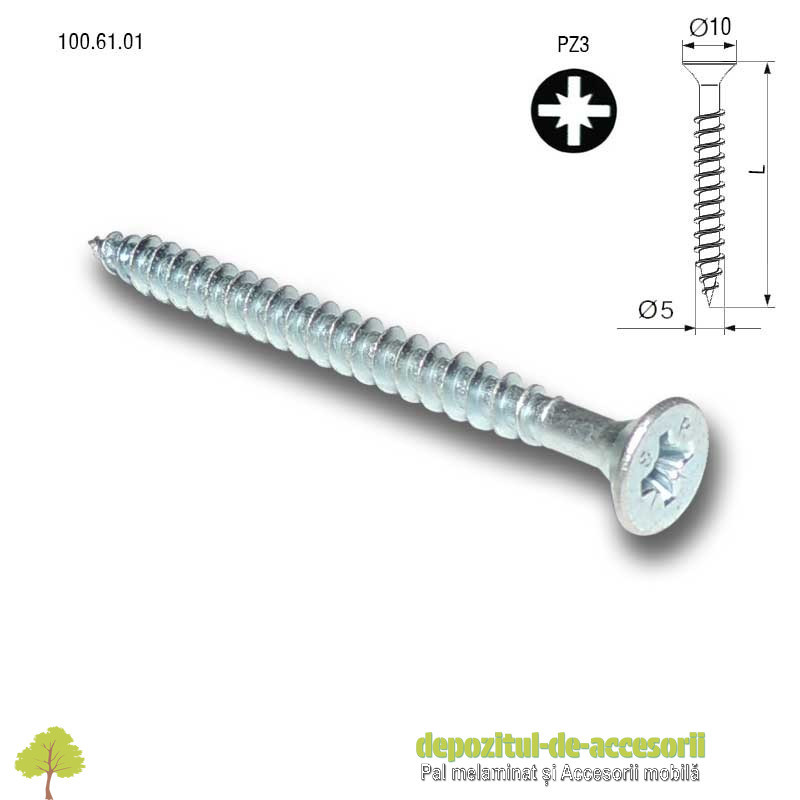 Șuruburi lemn, PAL Ø6 x 100mm, cap îngropat Pz3, zincate alb: șurubul face parte din categoria holtșuruburilor autofiletante pentru lemn, folosit îndeosebi la montarea corpurilor din PAL, MDF sau lemn. Este construit...